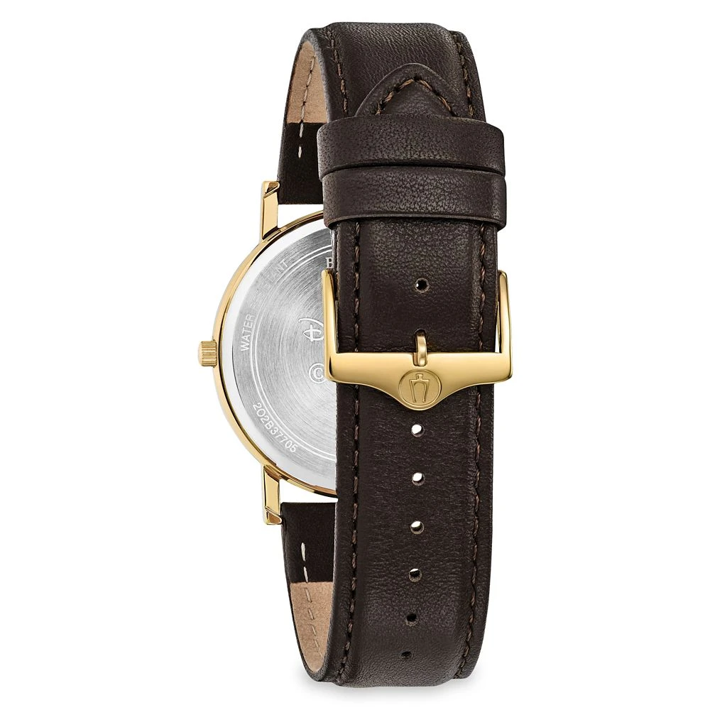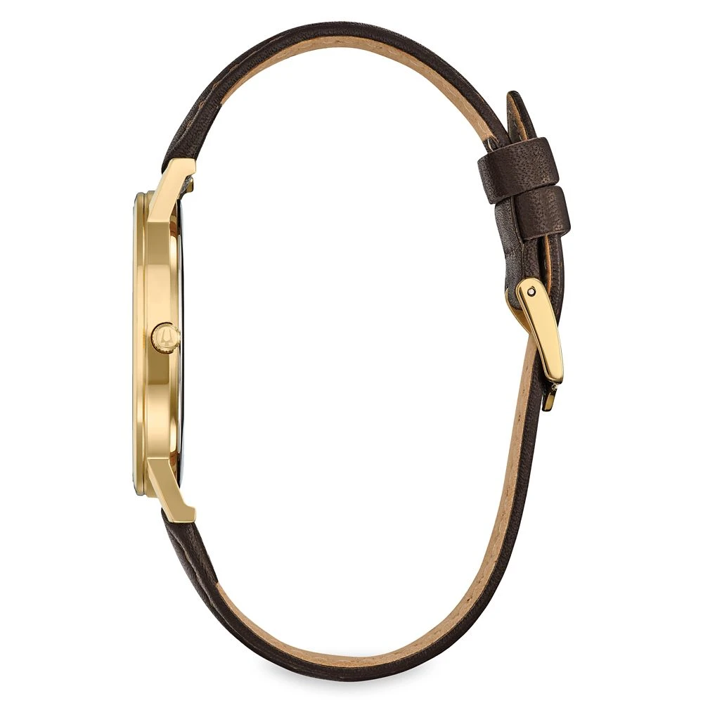 - Smooth grain dark brown leather strap with three-piece buckle closure