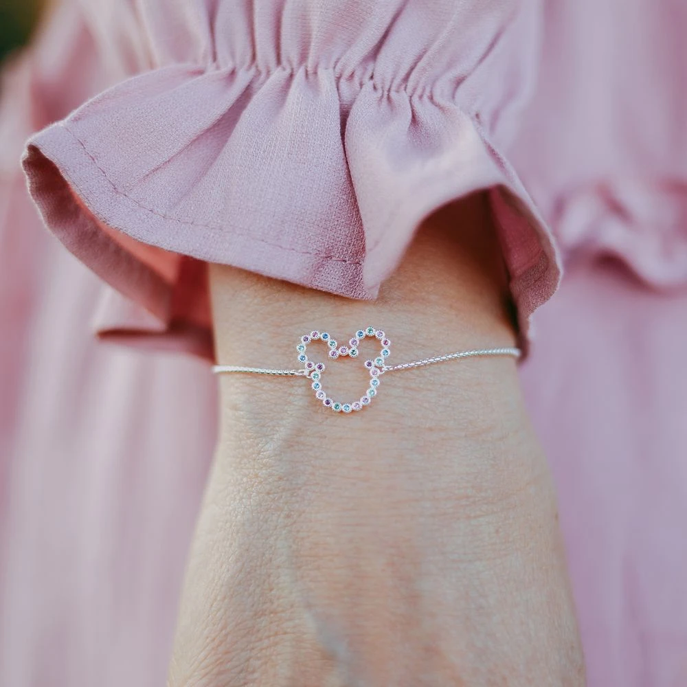 Every sparkle is worth a thousand smiles with this Mickey Mouse icon bracelet by Rebecca Hook. Beautifully crafted in sterling silver, the bolo-style bracelet features blue, green, pink, and purple nano gems. Adjustable to assure a perfect fit, it makes a wonderful gift for someone you love or a special treat for yourself.