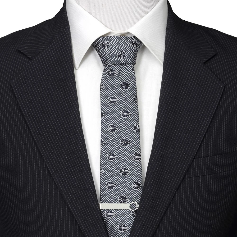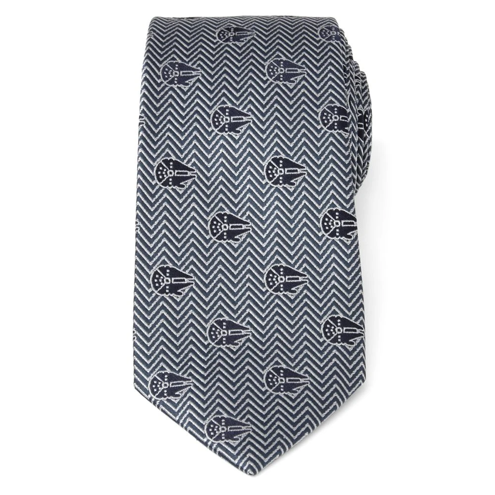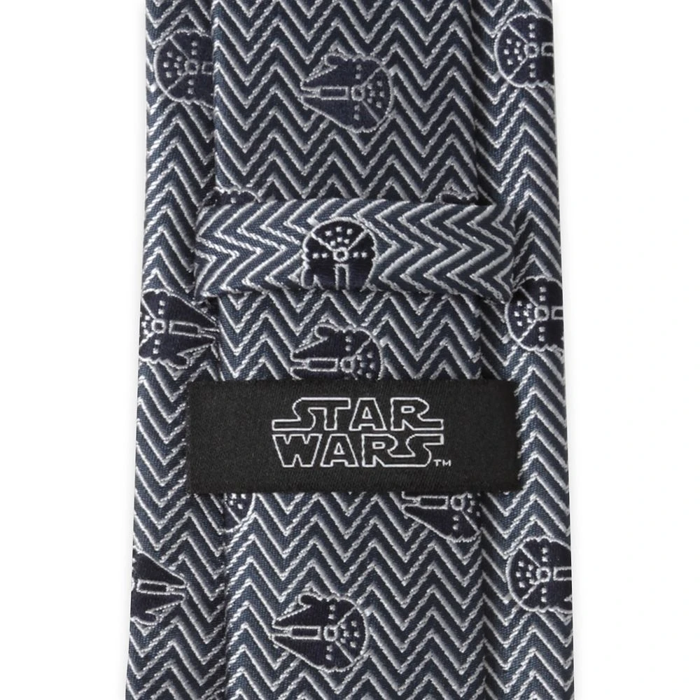 ”Fly casual,” but dress formal with this stylish black and grey herringbone tie featuring the fastest hunk of junk in the galaxy. Made with 100% silk, this Millennium Falcon tie is a must for Star Wars fans.